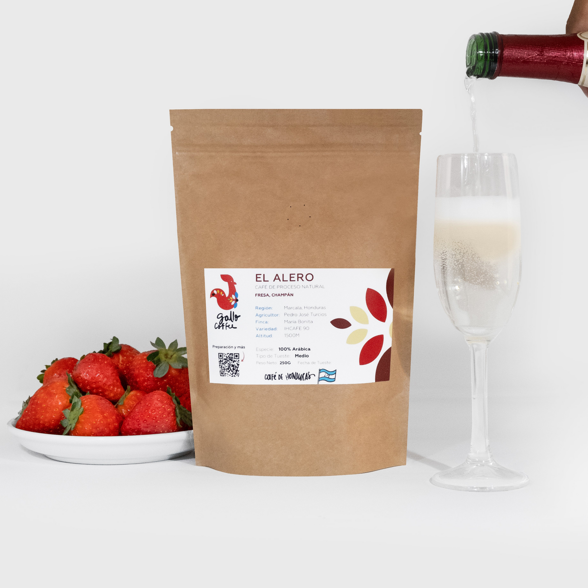 Nuestro café natural, El Alero, presenta sabores únicos e intensos con notas de fresa y champán. Es un café que ha sido especialmente preparado para crear esta fusión de sabores incomparables. Al preparar tu primera taza sentirás el aroma intenso a frutas y un sabor de café clásico elevado por las notas de fresa y champán, todo con un cuerpo ligero y jugoso. Al igual que nuestro café honey “La Chamba”, este café natural ha sido cultivado por Pedro Turcios y su familia en la finca María Bonita de la región de Marcala, Honduras.