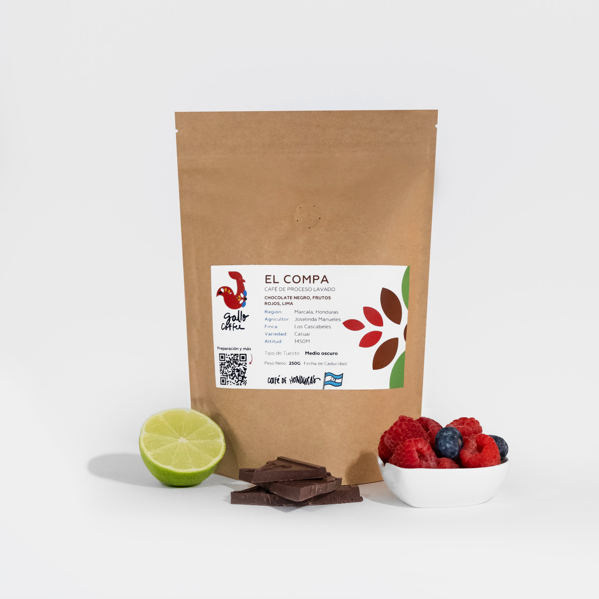 Como un amigo confiable, El Compa está ahí para ayudarte en todas tus mañanas. Este café, versátil y fácil de preparar, es ideal para espresso, solo o con leche. Su tueste medio-oscuro resalta las notas irresistibles de chocolate negro, frutos rojos y un toque de lima, que te transportarán a las montañas de Honduras y darán un increíble comienzo a tu día. El Compa es producido por Joselinda Manueles en su finca familiar Los Cascabeles, ubicada en Marcala, Honduras, donde junto con su esposo e hijos cultivan café de alta calidad y con prácticas ecológicas. Los hijos de Joselinda son la 5ta generación de caficultores en la familia.